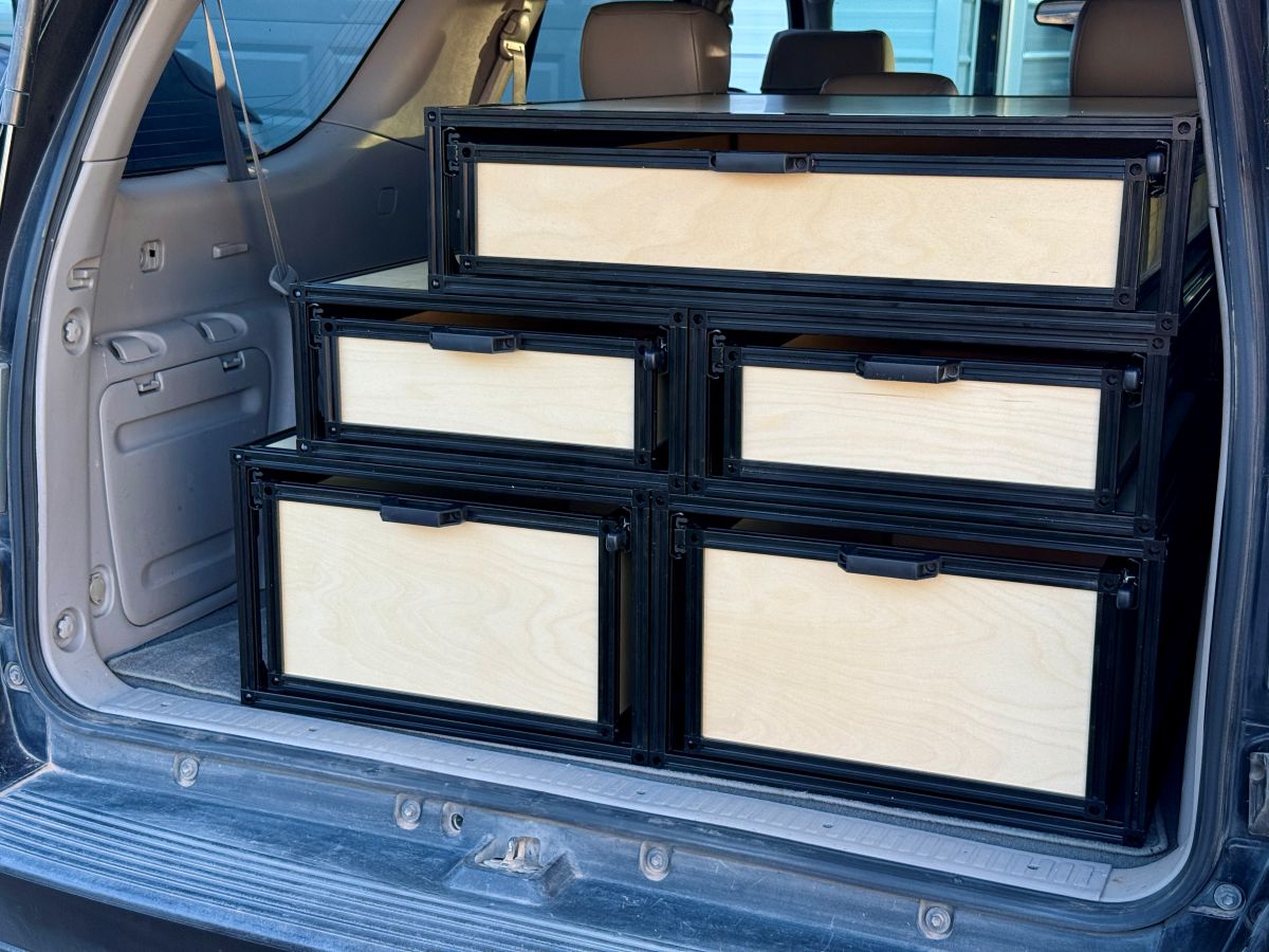 Whether you're gearing up for a multi-week overlanding trip or a quick weekend escape, our modular SUV storage drawers keep your gear organized, secure, and easy to access. Built with a rugged aluminum frame, these drawers are designed to handle rough roads and years of adventure. With multiple size options, you can customize your rear cargo space to fit your exact setup—so every piece of gear has its place when you need it.